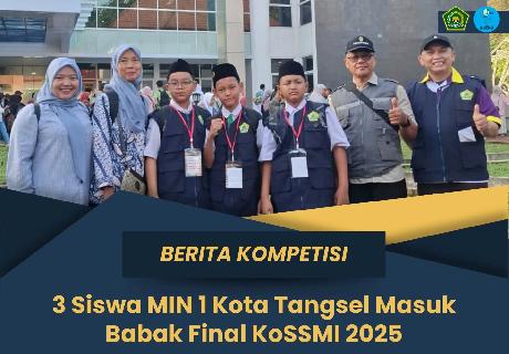 Prestasi membanggakan diraih oleh tiga siswa MIN 1 Kota Tangerang Selatan yang berhasil melaju ke babak final Kompetisi Sains Siswa Muslim Indonesia (KoSSMI) 2025, ajang nasional bergengsi yang digelar di Sekolah Vokasi IPB University pada 10–12 Mei 2025. Mereka adalah Muhammad Arkhan Akmal Hasyim (IPA Level 2), Muhammad Kenzie Alfian...